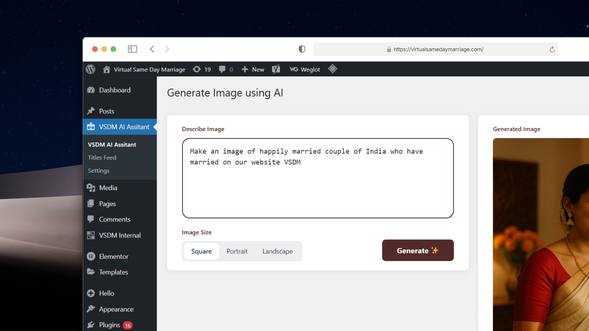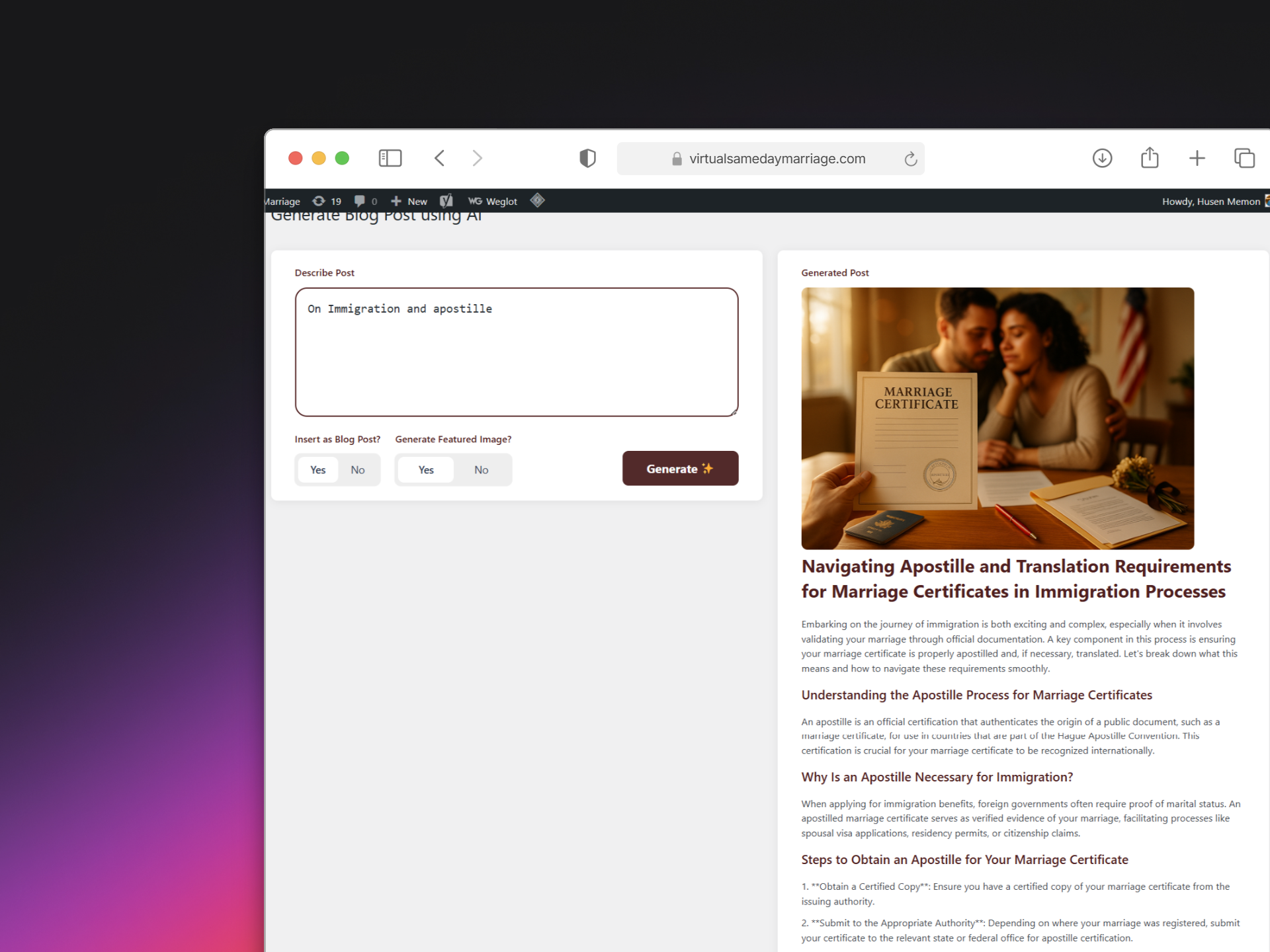 Our team developed a powerful AI-driven auto-blog and image generation system for Virtual Same Day Marriage (VSDM). The solution enables the client to generate SEO-friendly blog posts and high-quality images directly from the WordPress dashboard. With just a description, the system creates engaging blog content and auto-generated images that are instantly published or stored in the media library.