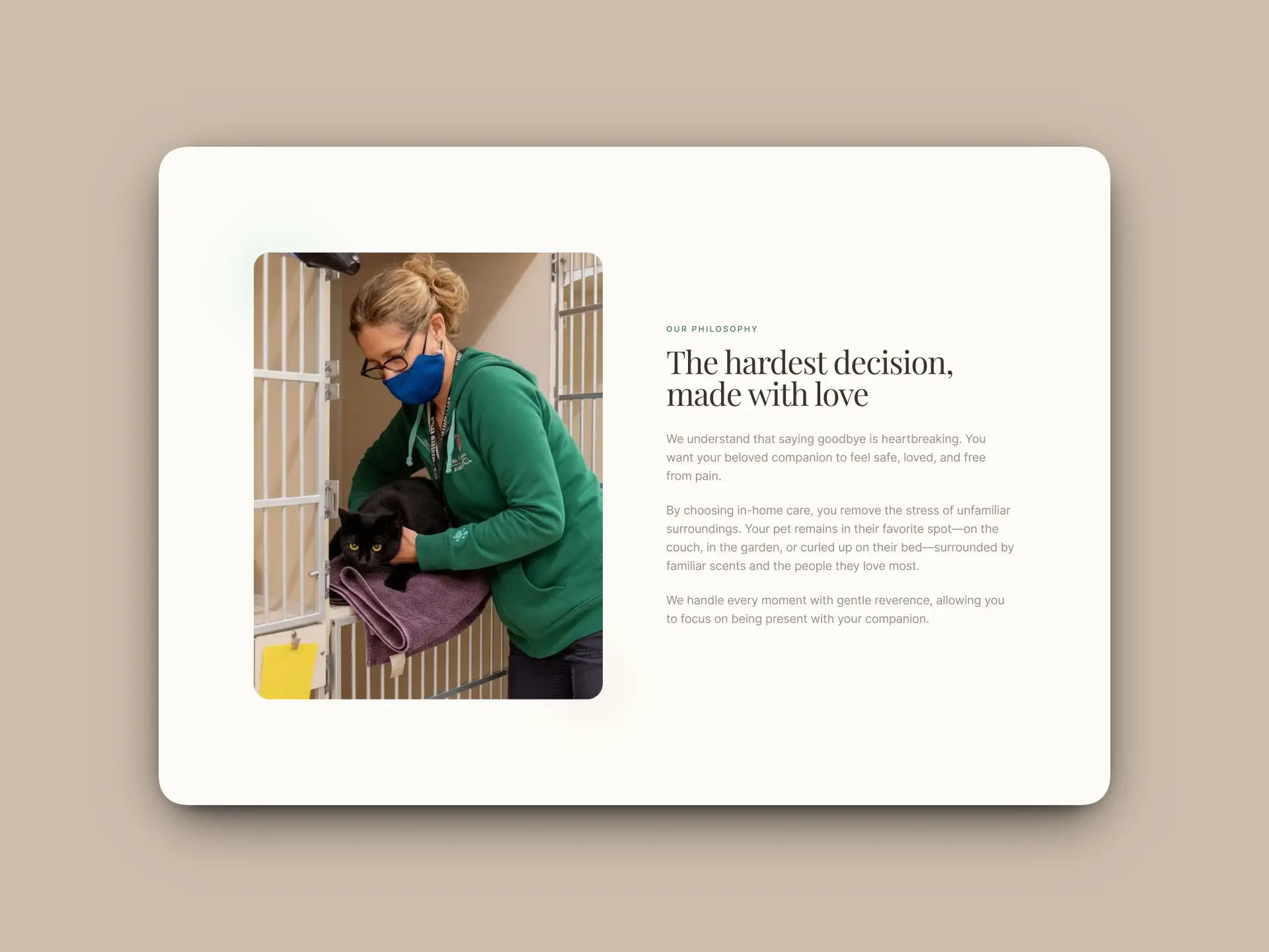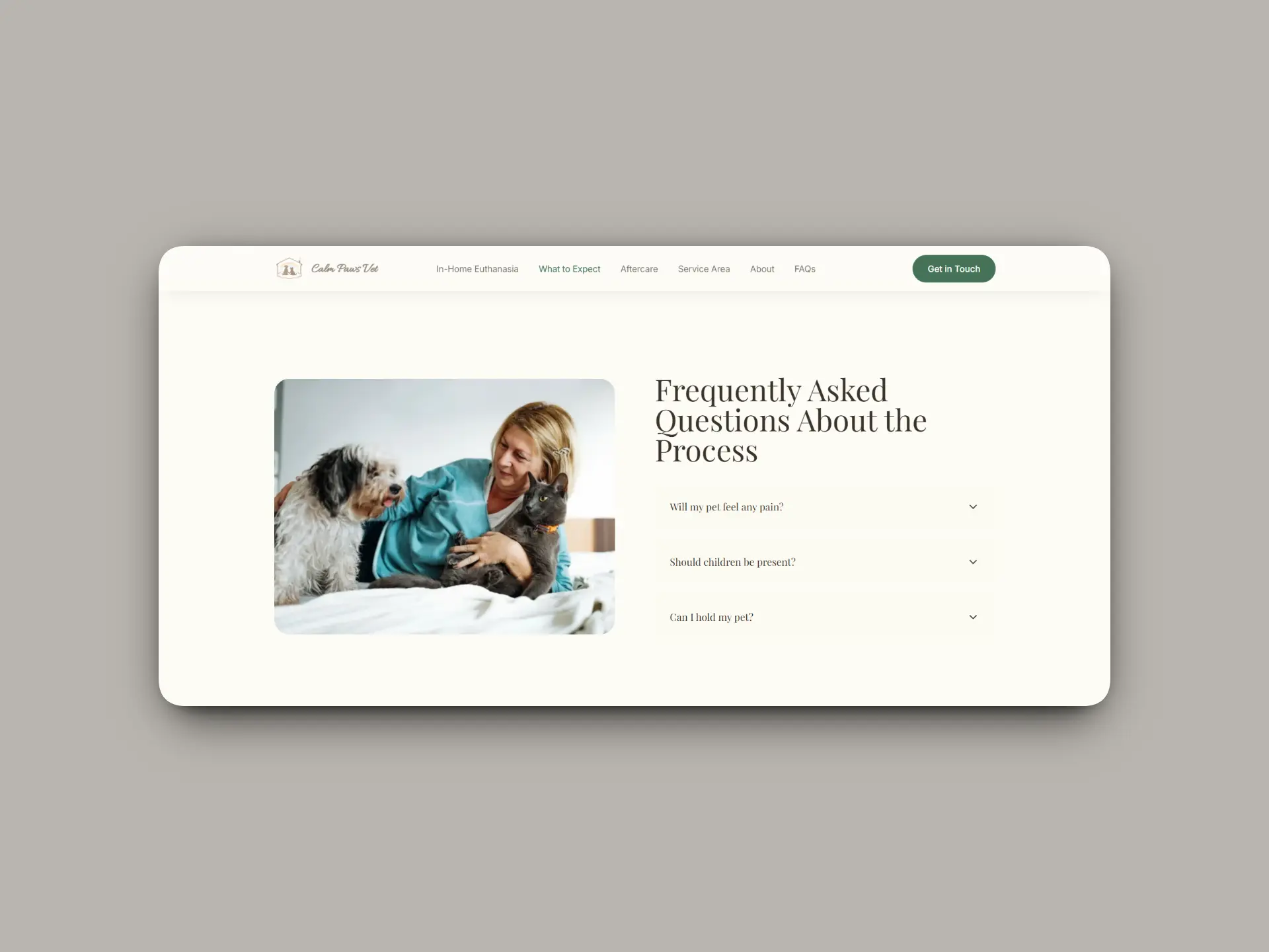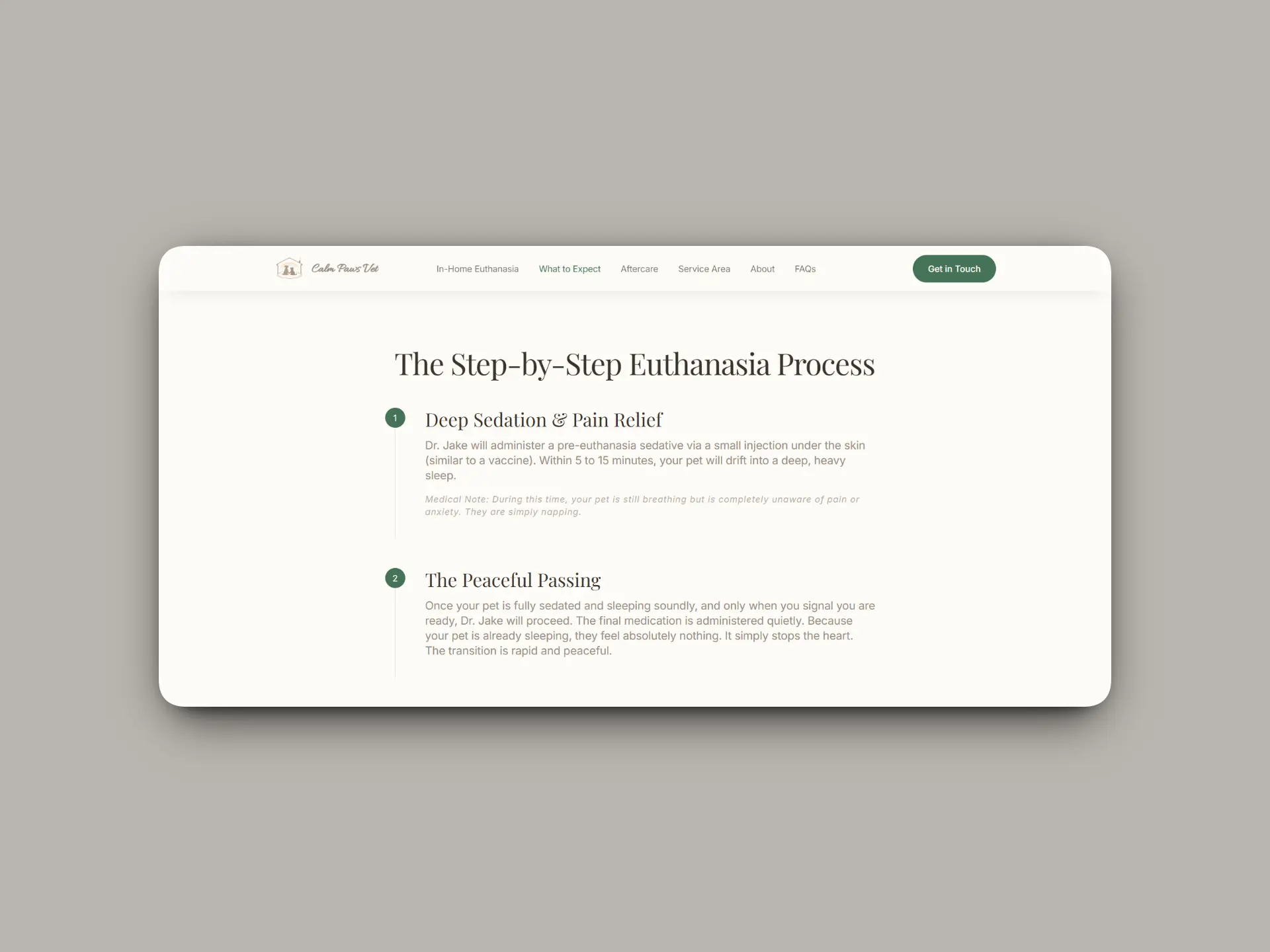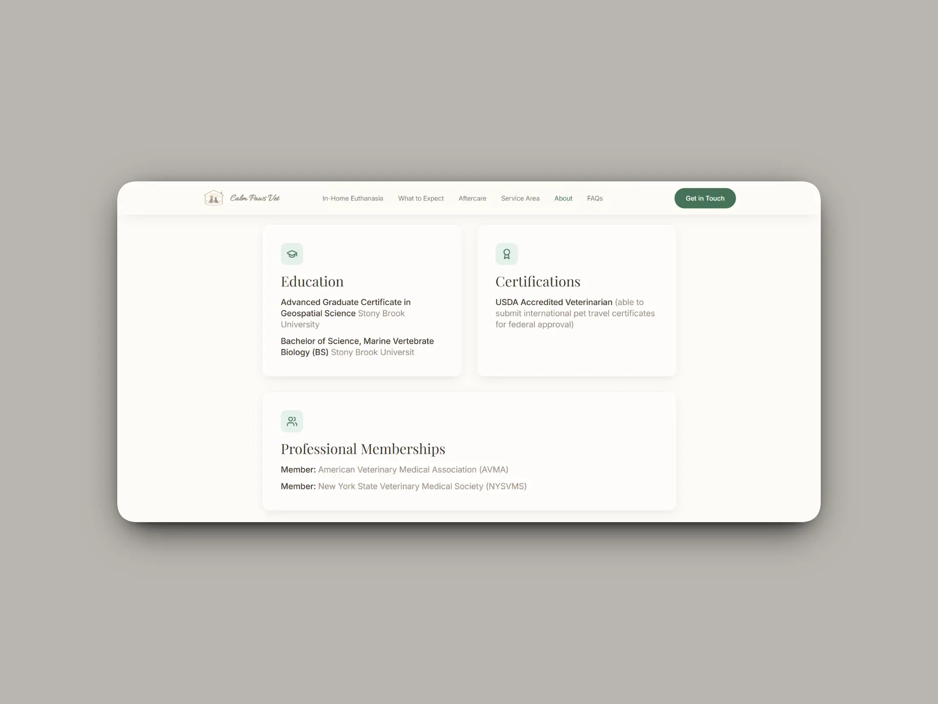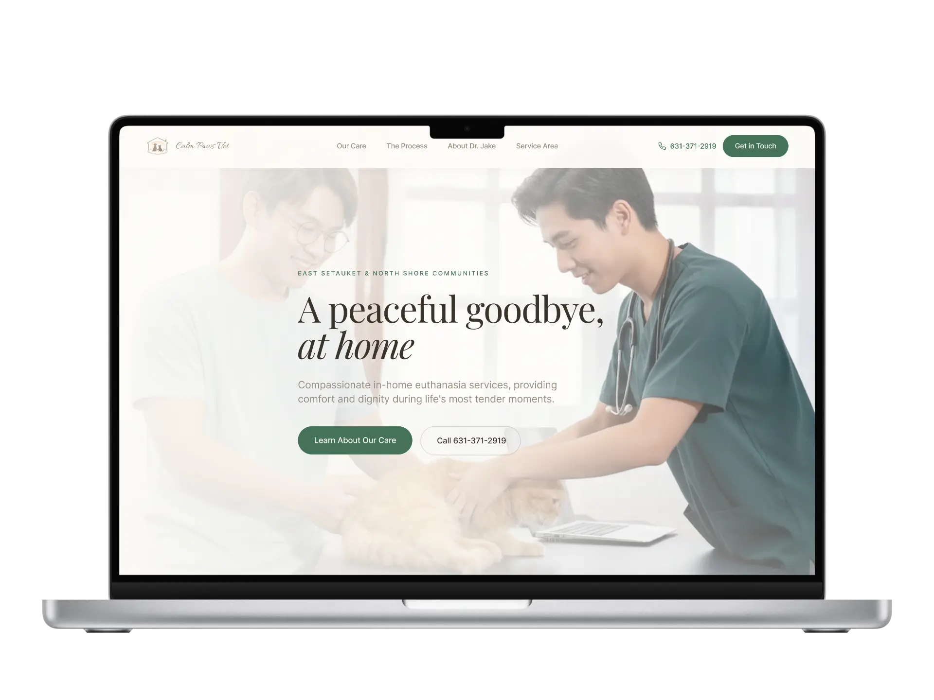 Calm Paws Vet is a veterinary service provider offering compassionate in-home pet euthanasia and end-of-life care for pets across East Setauket and surrounding Long Island communities. The goal of this project was to create a calming, informative, and easy-to-navigate website that reflects the sensitive nature of the services provided.
