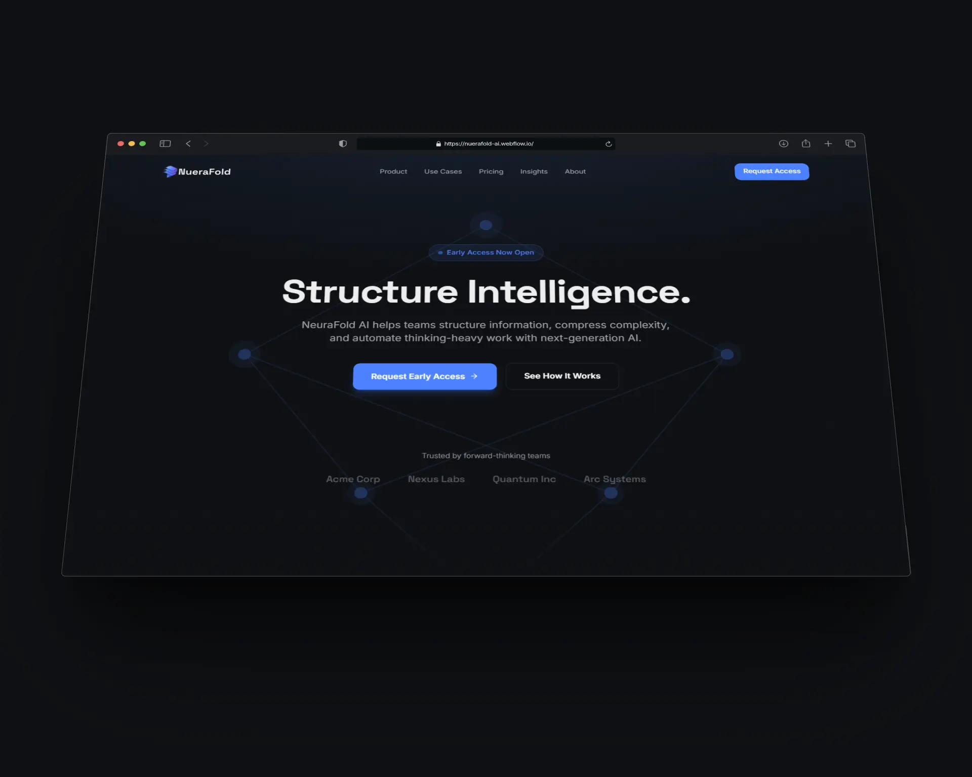 NueraFold AI is a demo Webflow website created by our team to showcase our ability to design and develop modern AI and SaaS-style websites using Webflow.