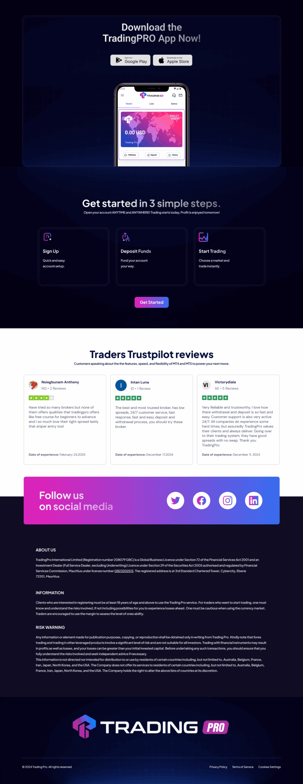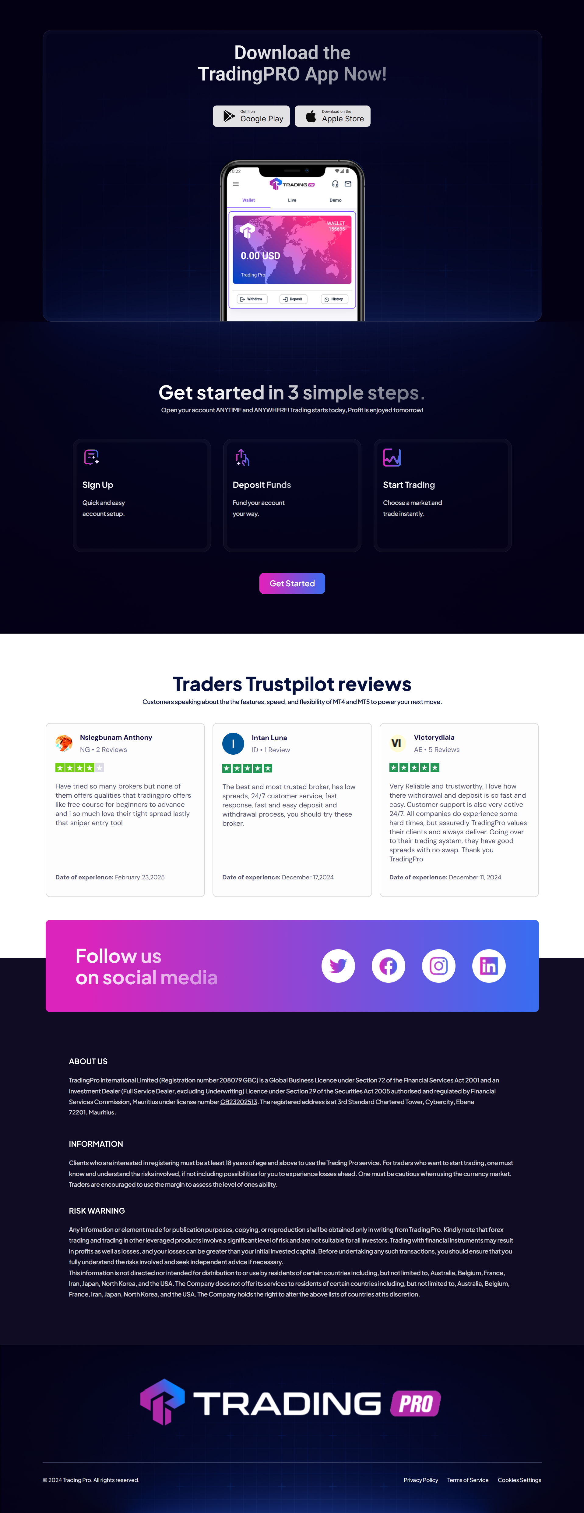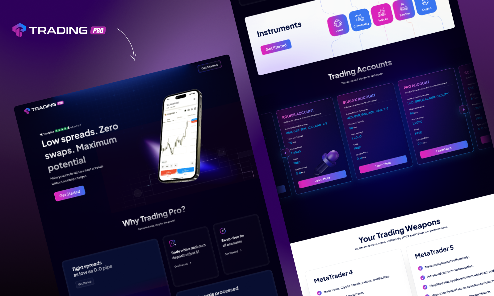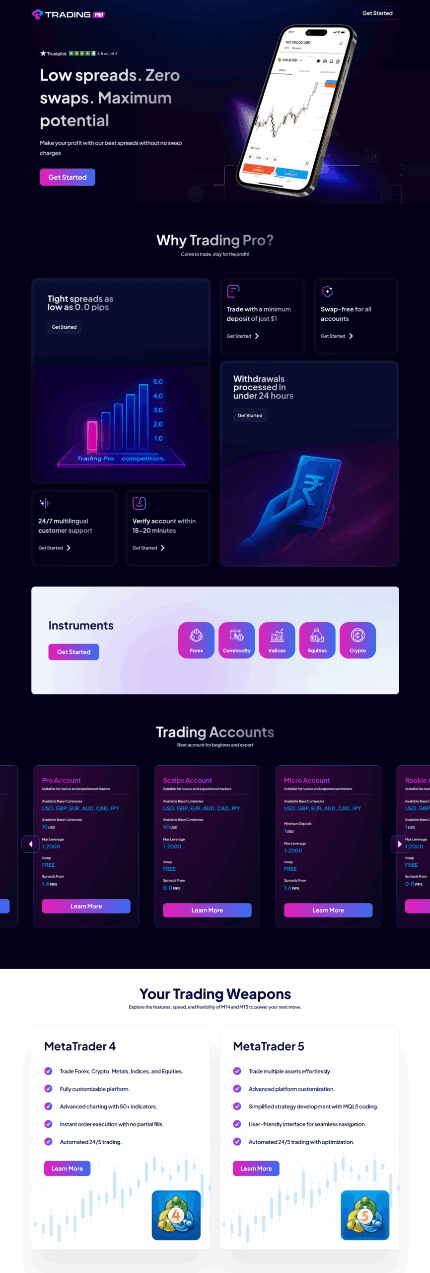 We designed and developed a high-converting landing page for TradingPro, a globally recognized multi-asset trading platform. The objective was to create a responsive, fast-loading, and conversion-focused page that effectively communicates TradingPro’s unique selling propositions, such as ultra-low spreads, swap-free accounts, rapid withdrawals, and multilingual support. The design was meticulously crafted in Figma and implemented using WordPress with Elementor, ensuring a seamless user experience across all devices.